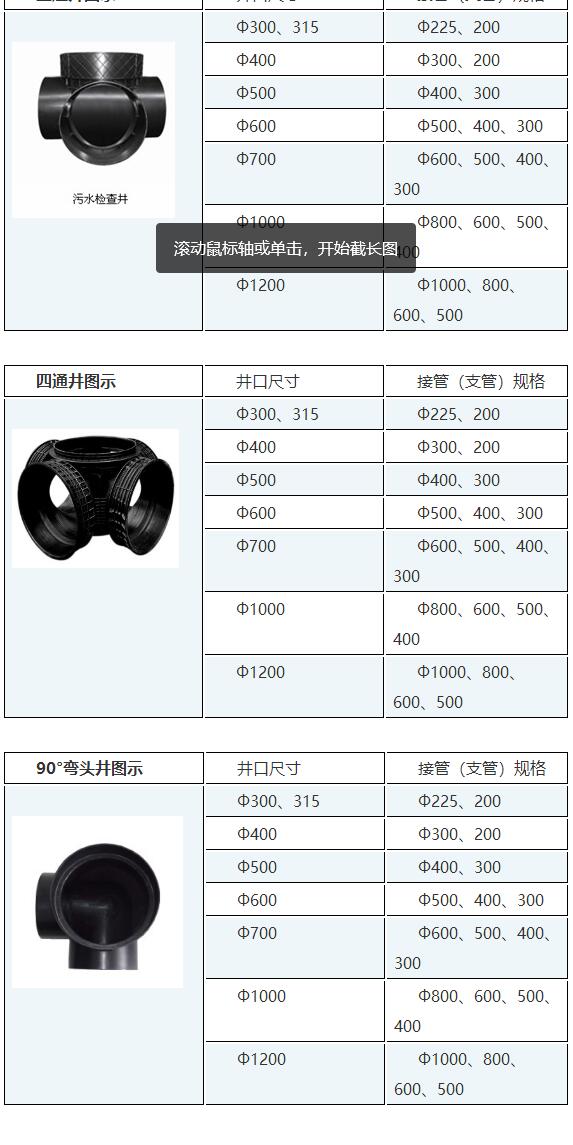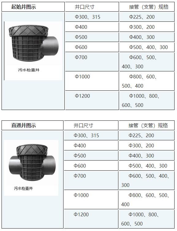 塑料檢查井可以分為起始井、直通井、三通井、四通井、90°彎頭井,如果是要進行污水處理,那么需要增加沉泥槽,以方面把污水中泥土等雜質聚集起來進行處理。以龍康的塑料檢查井為例,具體的規格如下: